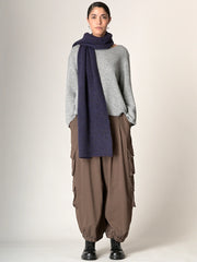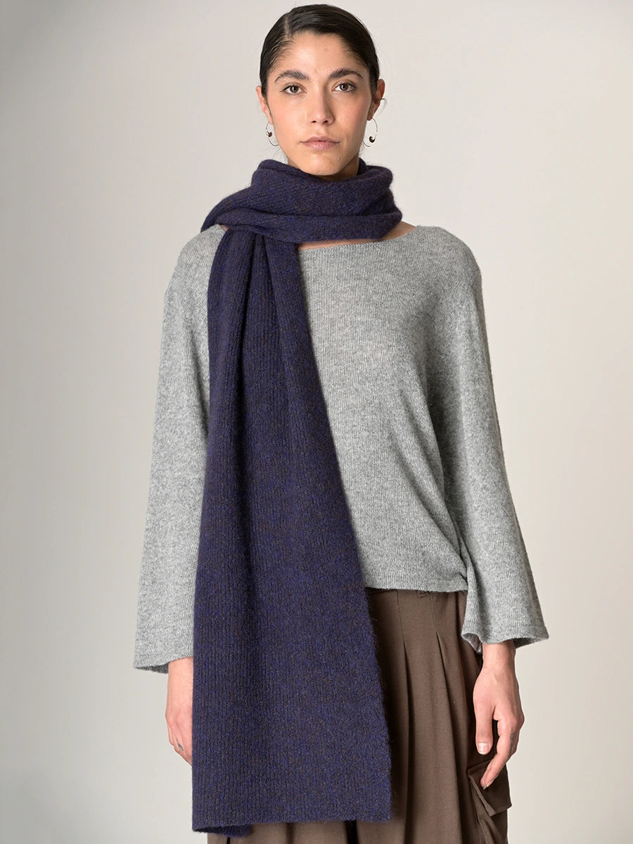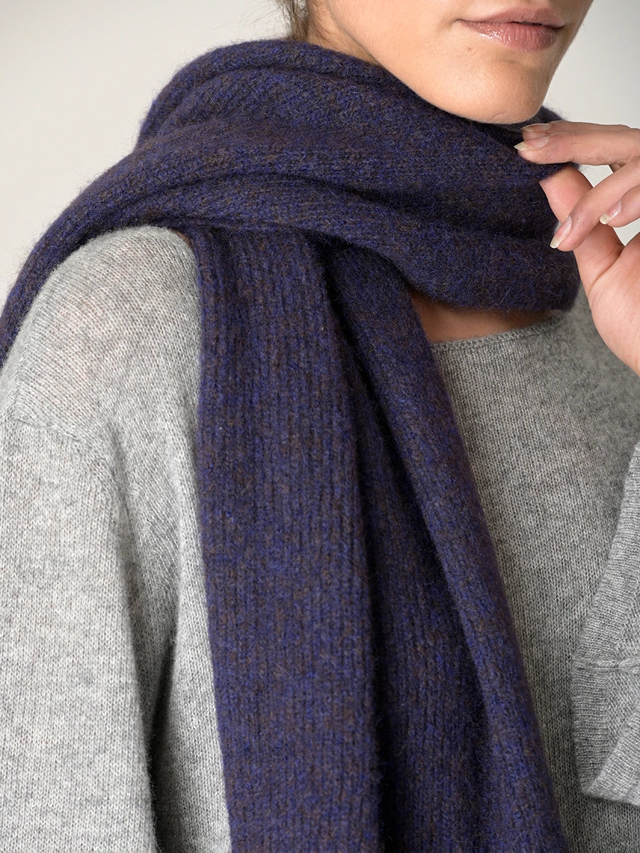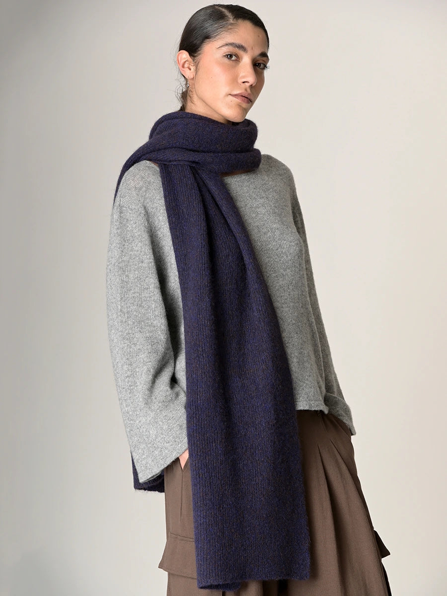This oversized long scarf is knitted from a tactile yak and alpaca blend yarn in a ribbed construction. The soft mustard tone is designed to add a brighter shade to the dark winter outfits.