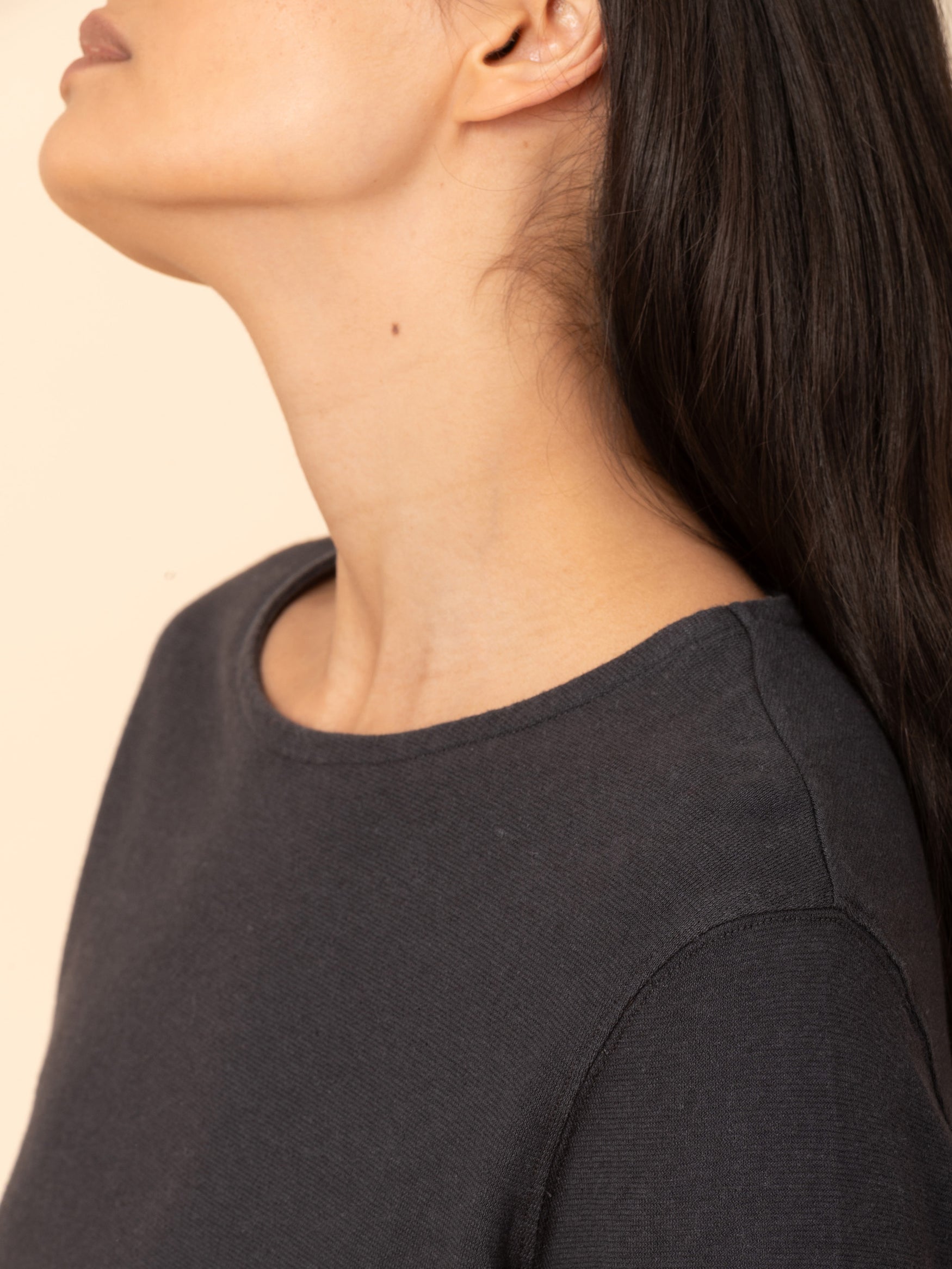 Gili T-Shirt is a long sleeve style with a more fitted silhouette, designed for a clean yet casual look. It features a mock neck, fitted sleeves, and side panels cut on the cross-grain to help hold its shape. Felted seams add to the structure and durability. Made from mid-weight cotton with a soft waffle texture, it’s a versatile piece you can wear comfortably across seasons.