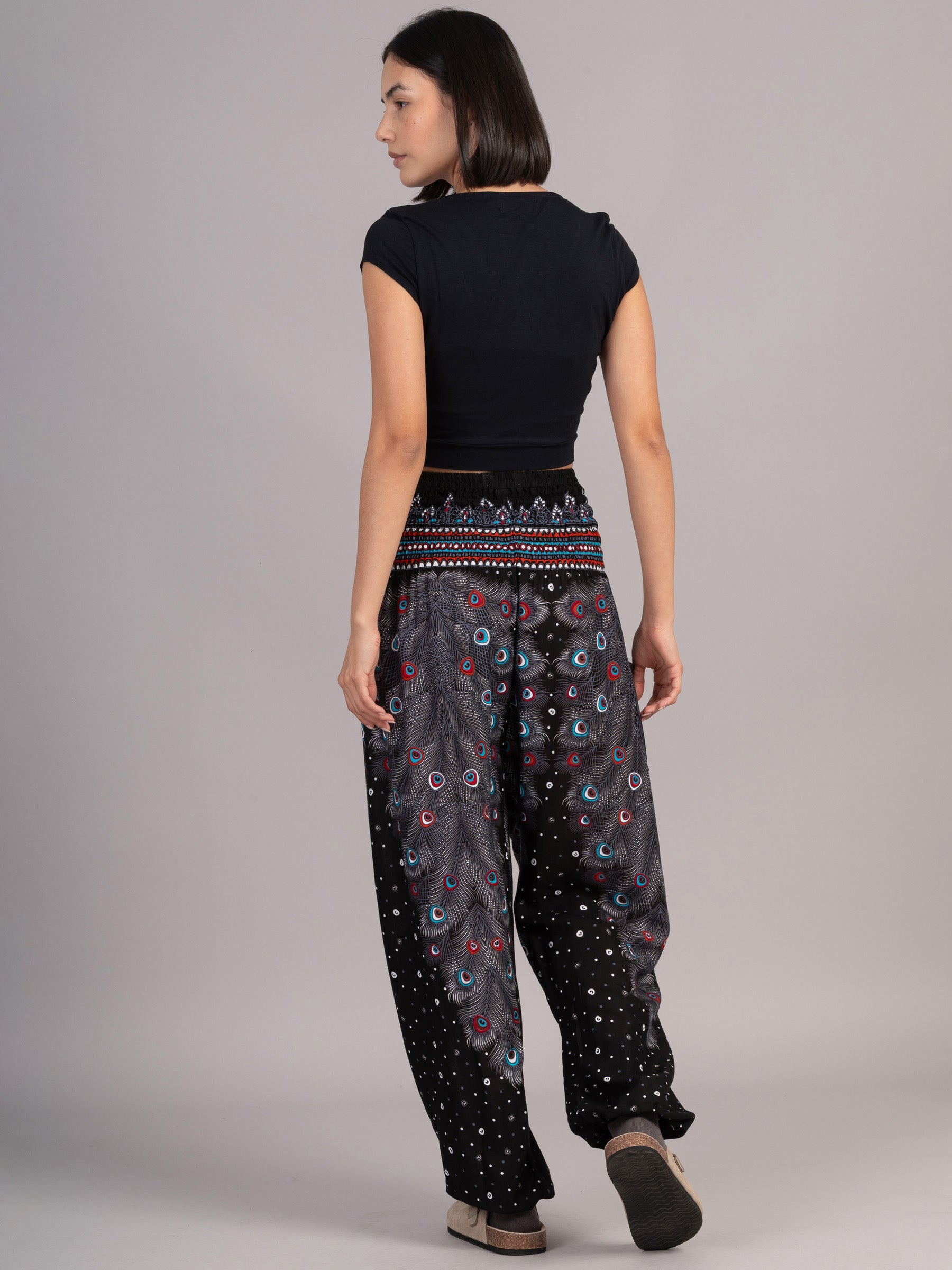 Beautifully soft and comfy, these high crotch peacock harem pants for women are made of 100% high grade rayon which is a natural, plant-based fabric. Highly breathable and flowy, they are ideal for wearing in hot climates, festivals, lounging, yoga & mediation. Equipped with wide elasticated waist and ankle bands, they provide amazing comfort and allow great body movement without restrains. Our peacock harem trousers are available in two sizes: S/M (34-40) and L/XL (42-48), great for all shapes from petite to plus size.