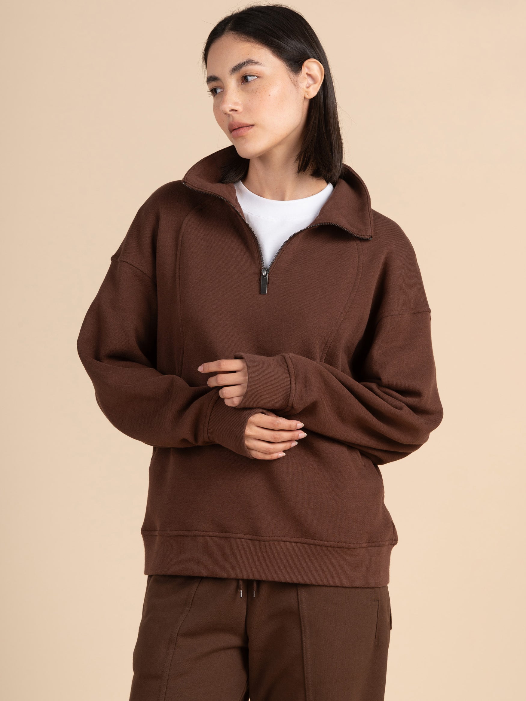 Sark reprend le confort d'un sweat-shirt et lui apporte une touche raffinée. Confectionné dans un luxueux molleton de chanvre et de coton biologique, ce tissu ultra-doux et épais est brossé à l'intérieur pour offrir une chaleur et un confort exceptionnels. Des détails bien pensés - un col zippé élégant, des empiècements de forme unique et des poignets avec passe-pouces - créent une silhouette soignée avec une touche après-ski décontractée, parfaite pour s'habiller de manière chic ou décontractée.
